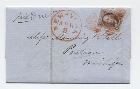 to Pontiac Michigan. Red square grids and red CDS, two vertical file folds (one toned; the other slightly impacts stamp). Unusually, has a "due 5" marking at upper left and a partially erased "due 5" in pencil at bottom - the cover was over 300 miles so should have been 10 cents. New York is the most common origin for 5 cent 1847 covers, of course, but an underpaid cover with a due marking is quite unusual; the Classics Society census lists maybe 2 dozen examples from New York. 4 margin stamp, very close at lower left; crease is barely noticeable at the bottom right corner of the stamp. 2010 PF cert accompanies. SOLD