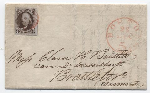 Very nice example of Scott 1a, with the Dot in S variety, tied on a folded letter from Boston. Dec. 23, 1847 use; personal letter content; circular grid on stamp, sent to Brattleboro VT. Pretty stamp with huge right margin; full top and bottom margins; narrow left margin to just at the frameline at bottom left. Wonderful example of this uncommon shade, with new PSAG certificate. SOLD