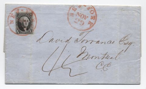 Pretty New York to Montreal, Canada use of the 10 cent 1847 issue, Scott 2. Red CDS; stamp with sharp impression and huge top and right margins; narrow left margin; cut in at bottom; a few light vertical file folds, one of which impacts stamp. 4 1/2p Canada rate; business letter content. Some light adhesive may have been used in a prior mounting or to keep letter closed; it's a bit tacky. The online 1847 census shows 29 covers from New York to Montreal with a single #2. Lovely cover. With new PSAG certificate. SOLD