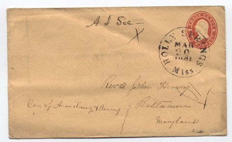 Nice 3 cent star die stamped envelope from Holly Springs, Mississippi.