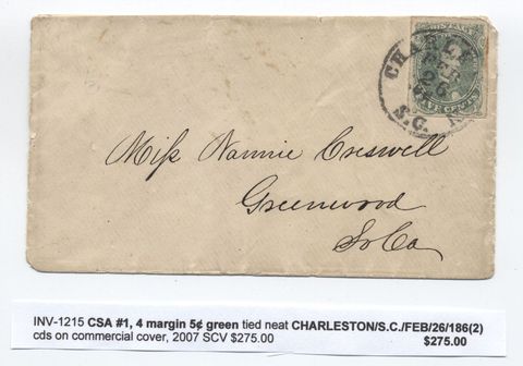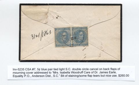in 1861. Scott 68XU1. Rimless marking with "paid" at center and 5 at bottom; small double circle Raleigh marking. Both a bit light; addressed to Independence VA. Prior dealer notes and pricing ($400), notes slight reduction at bottom. Additional pencil notes on reverse, including ex-Brugh and ex-Gallagher provenance. 2018 Scott $400 (versus the $600 in dealer note); valued at $500 in the 2012 CSA catalog. Affordable example of a Confederate provisional. $160