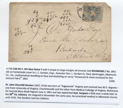 to Bentivoglio VA. Recipient spent some time as an assistant surgeon in the confederate army but was not addressed as such here. Mathematical calculations, some reverse docketing and flap damage, and a nibble at upper right of the cover. Stone Y stamps have a Scott value of $400 on cover. $80