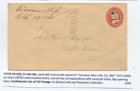 Neat use of US postage in Confederate Mississippi. Feb. 19, 1861 use from Torrance MS; 3 cent star die envelope with manuscript cancel, Carroll Hoy correspondence with usual pin holes and some tearing to backflap. Prior dealer notes identify Richard Hall and Plantation Collection provenance but is wrong about confederate catalog value of this use, which is $250 rather than $300. Still a good deal at... $100