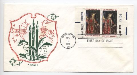 combo cover; it's the 1968 Christmas issue. Both are plate singles; Artopages cachet; it' s a predate for the untagged stamp. James McCusker has an example of this at $225; saying the only recorded sale in 1999 was for $266. Scarce modern tagging predate and first day cover! $90