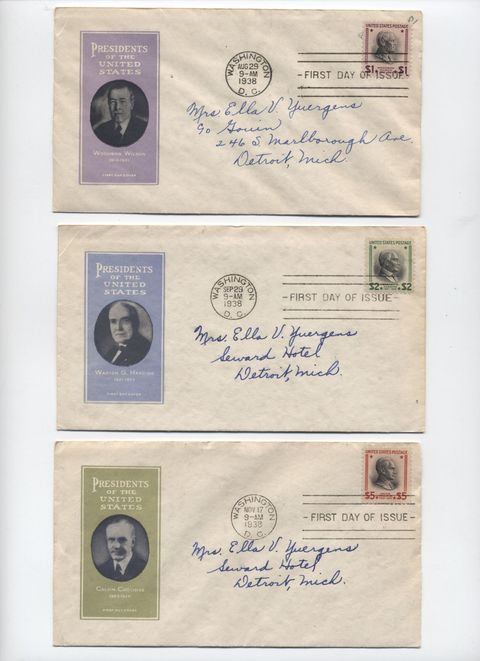 Full FDC set of the Presidential series of 1938, Scott 803-834. Including the dollar values (shown in the scan) Low denominations have Pavois cachets but the rest are Ioor. All addressed to the same person; covers with some corner dings, a few small stains and some wrinkling. Most of the value is in the 3 dollar values (Scott $380 for the 3). he rest are relatively inexpensive but Scott for the whole set is north of $500. $150