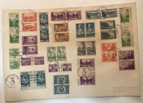 Spectacular large size first day cover from March 15, 1935. Washington DC 4 bar cancels; 20 pairs of Farley special printing stamps (mostly imperf, but with line pair of the Byrd stamp and a gutter pair of the 3 cent Newburgh). FDC of individual stamps don't have high catalog values, but this is a different story. Try finding another one of these! Exhibit piece if you collect the Farleys. $150