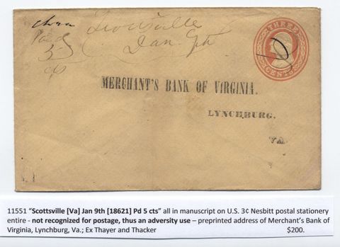 March 20, 1861 date, sent to Baltimore MD. CONFEDERATE USE, after Mississippi’s admission to the CSA and while the CSA continued to use the US postal system. Valued in the confederate catalog at $250; this example has a bit of soiling and a diagonal bend (doesn’t appear to be a full crease) that could presumably be flattened. Nice item! $100